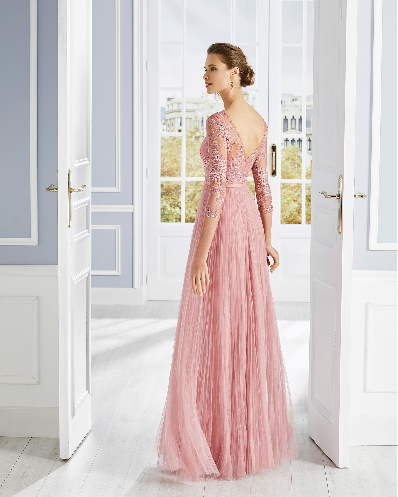 Abito da cerimonia in tulle con pizzo sul corpetto. Scollo illusione e maniche francesi.
