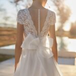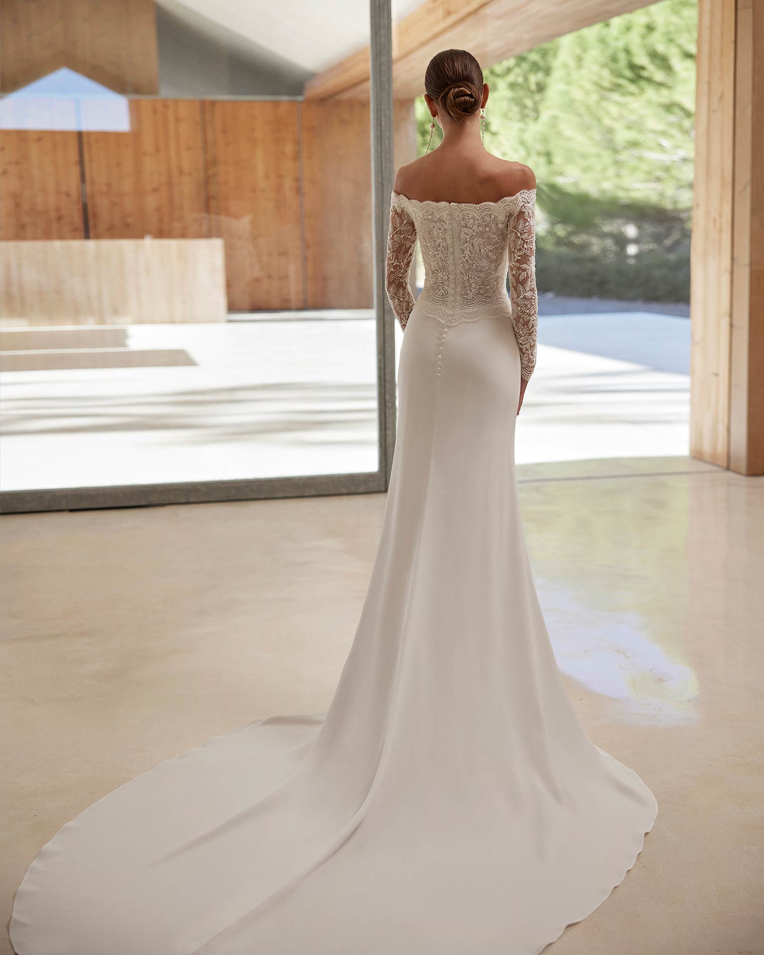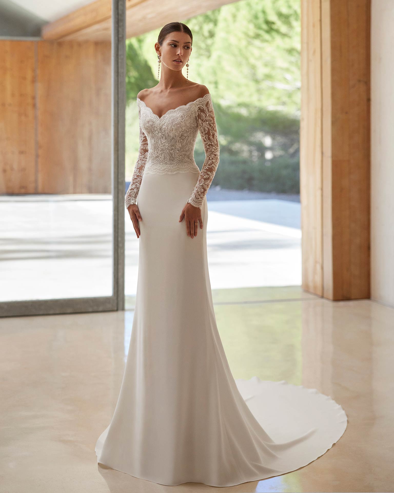 Elegante abito da sposa sirena confezionato in crêpe elasticizzato, pizzo e strass. Presenta uno scollo omerale e maniche lunghe. Un delicato abito Rosa Clará.