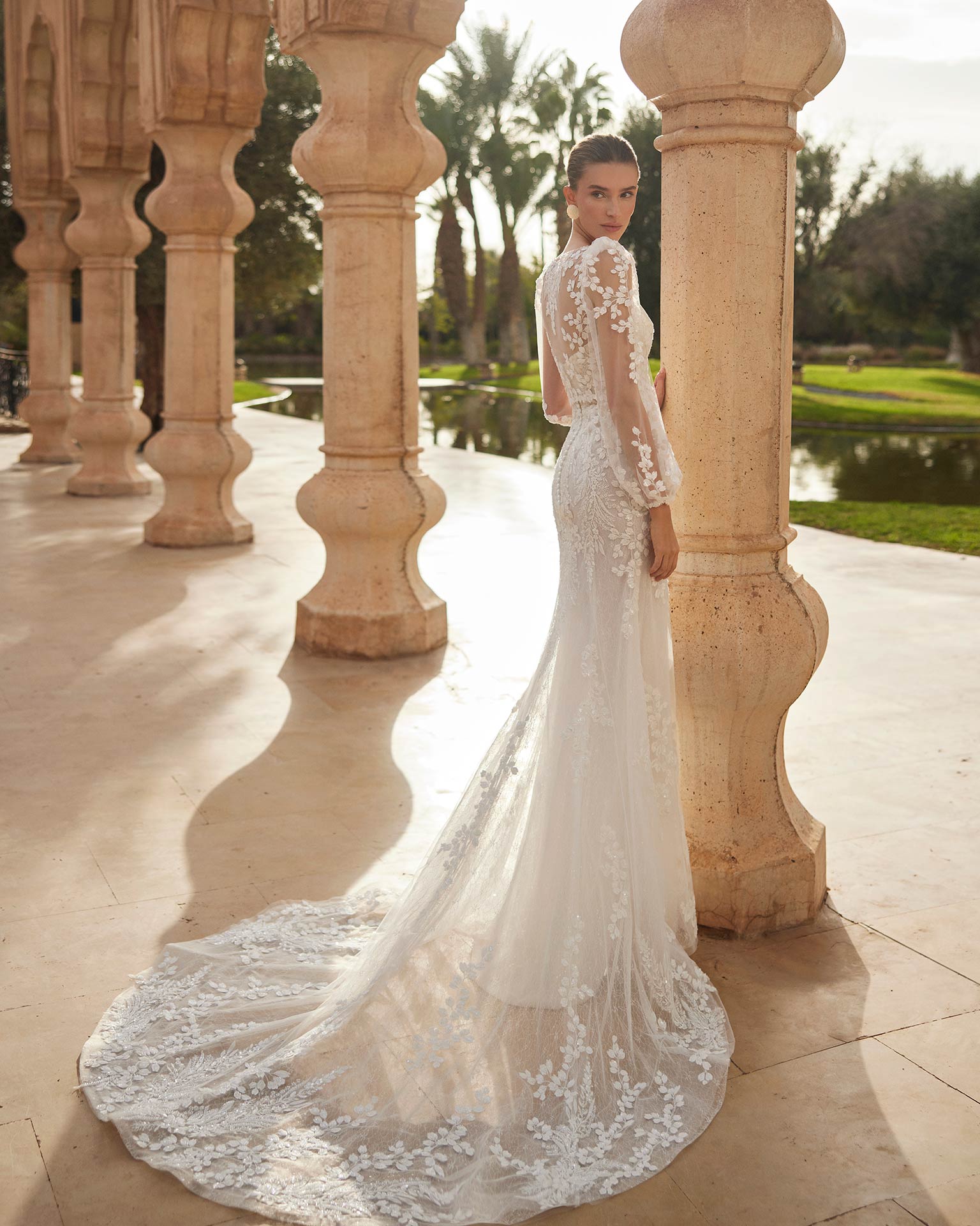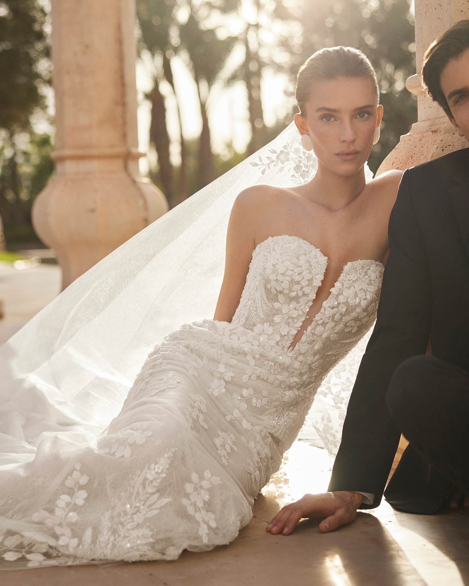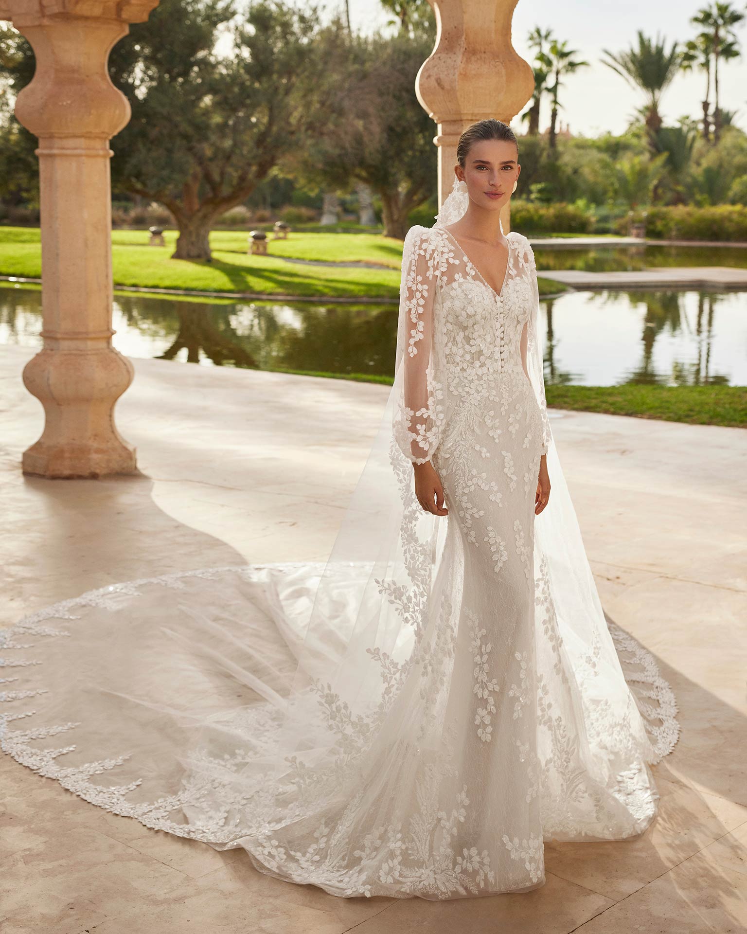Abito da sposa lungo, due pezzi, taglio sirena. Realizzato in pizzo con perline, scollo senza spalline e giacca.