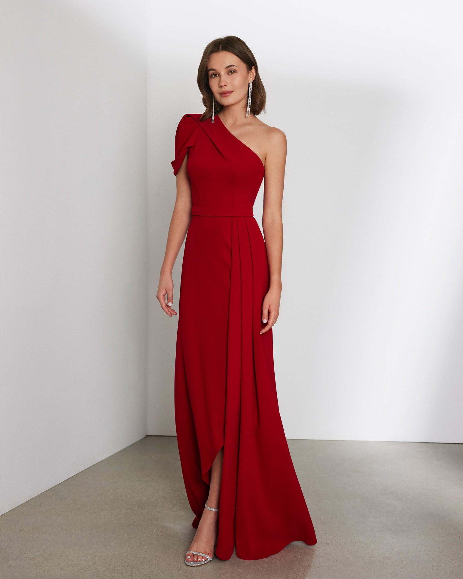 Abito da gala lungo in stile romantico. Confezionato in crêpe. Con scollo asimmetrico e schiena coperta e maniche corte. Modello Rosa Clará Cocktail di tendenza.