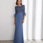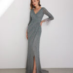 Abito da cerimonia di strass. Scollo interno a cuore e schiena coperta. Con maniche 3/4.