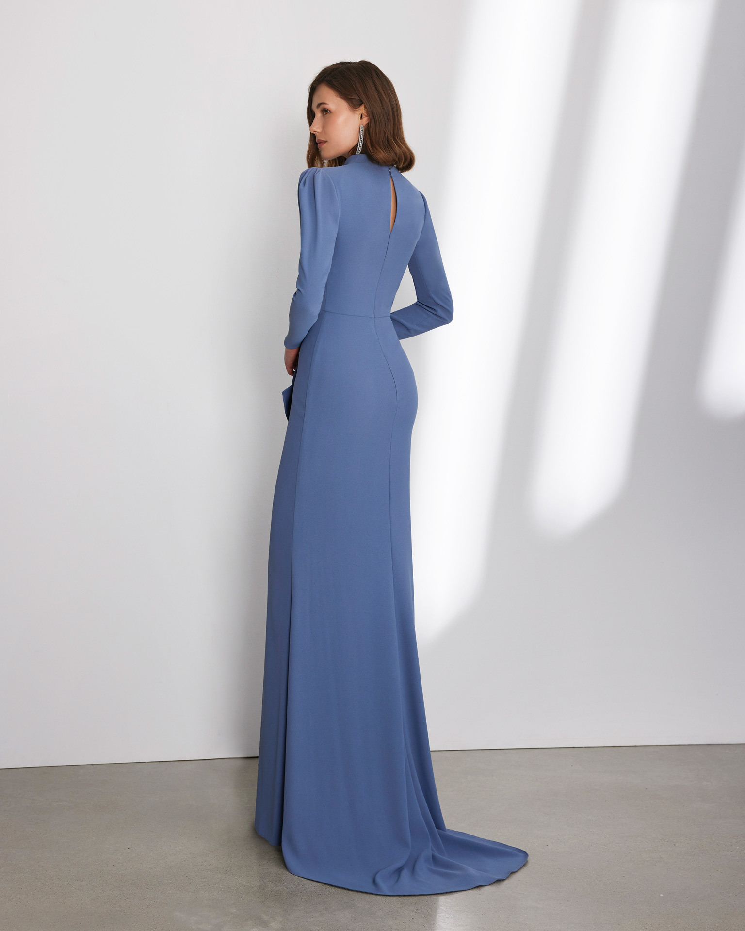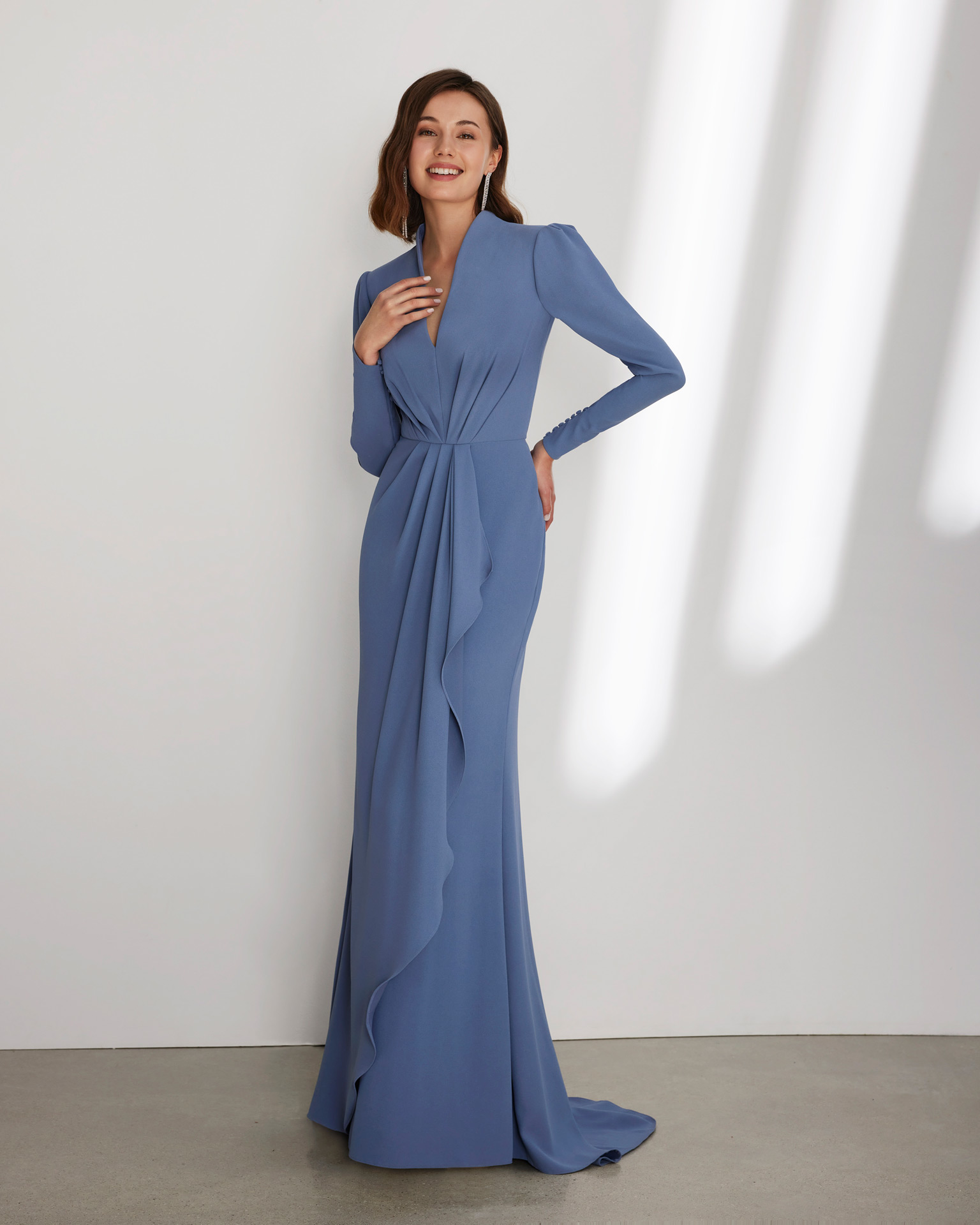 Abito da cerimonia lungo in stile semplice. Confezionato in crêpe con scollo a V, schiena a goccia e maniche lunghe. Gonna con spacco frontale. Modello Rosa Clará Cocktail di tendenza.