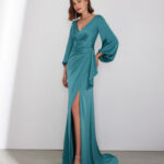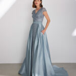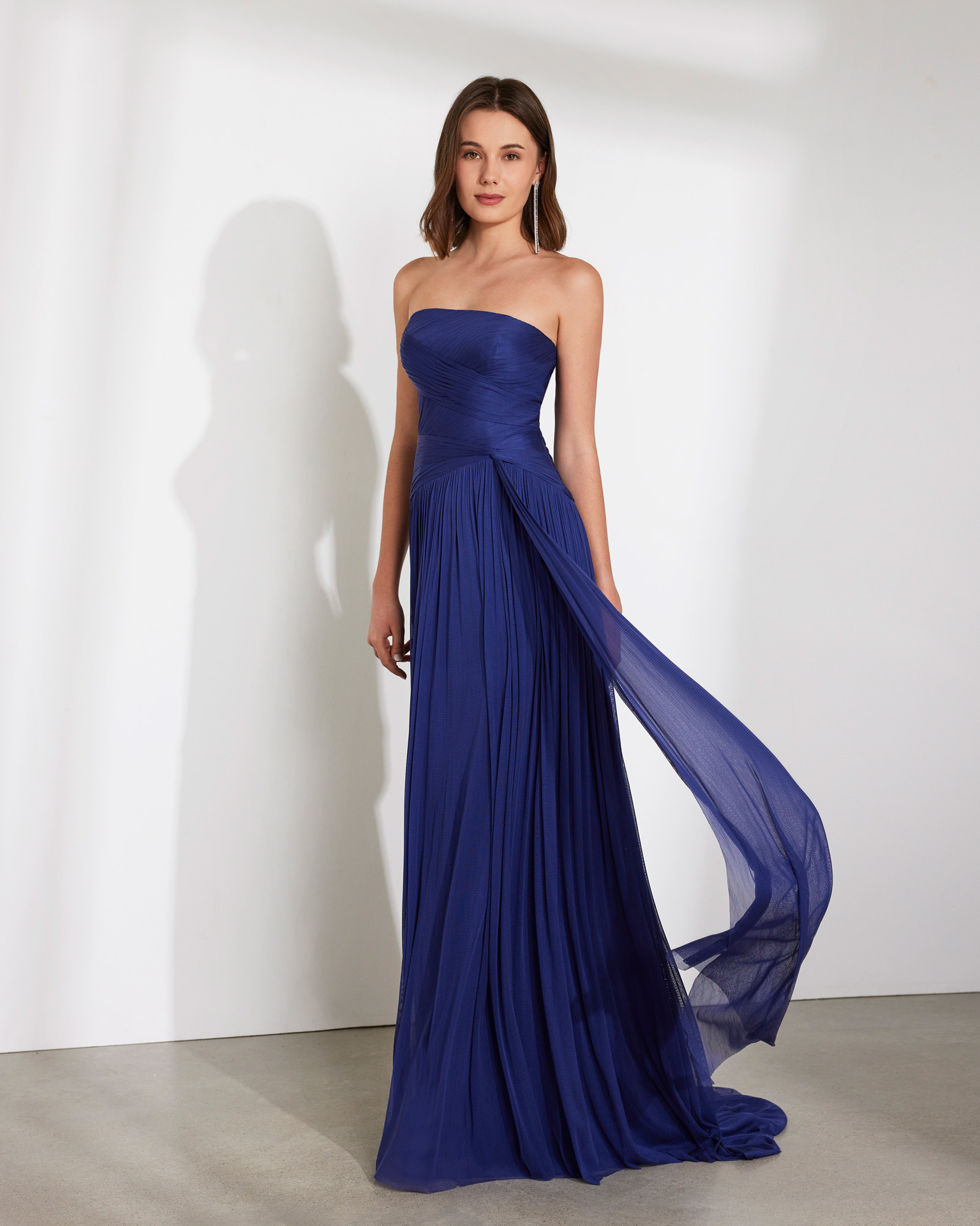 Abito da invitata lungo in stile elegante. Confezionato in muss con scollo senza spalline, schiena a corsetto e mantella. Modello Rosa Clará Cocktail per cerimonie e ricorrenze.