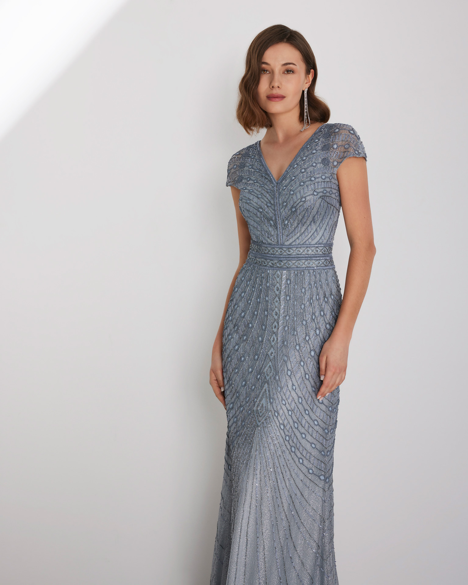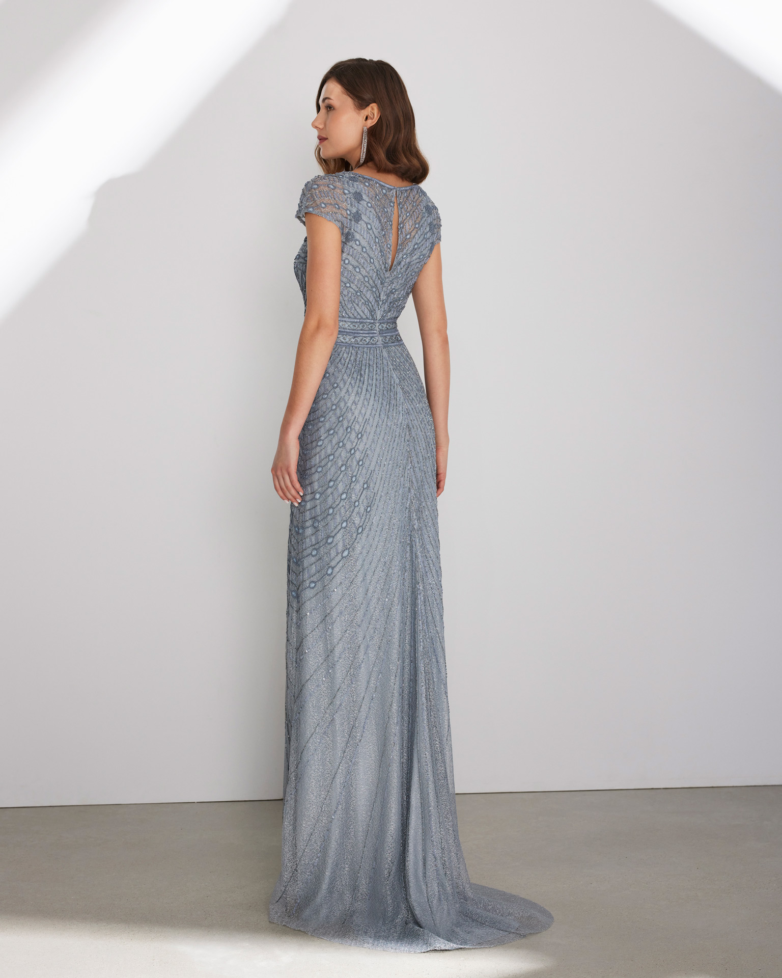 Abito da cocktail lungo in stile elegante. Realizzato in strass. Con scollo senza spalline e schiena a goccia, maniche corte e sopraggonna rimovibile. Completo Rosa Clará Cocktail per cerimonie e ricorrenze.