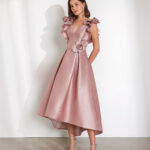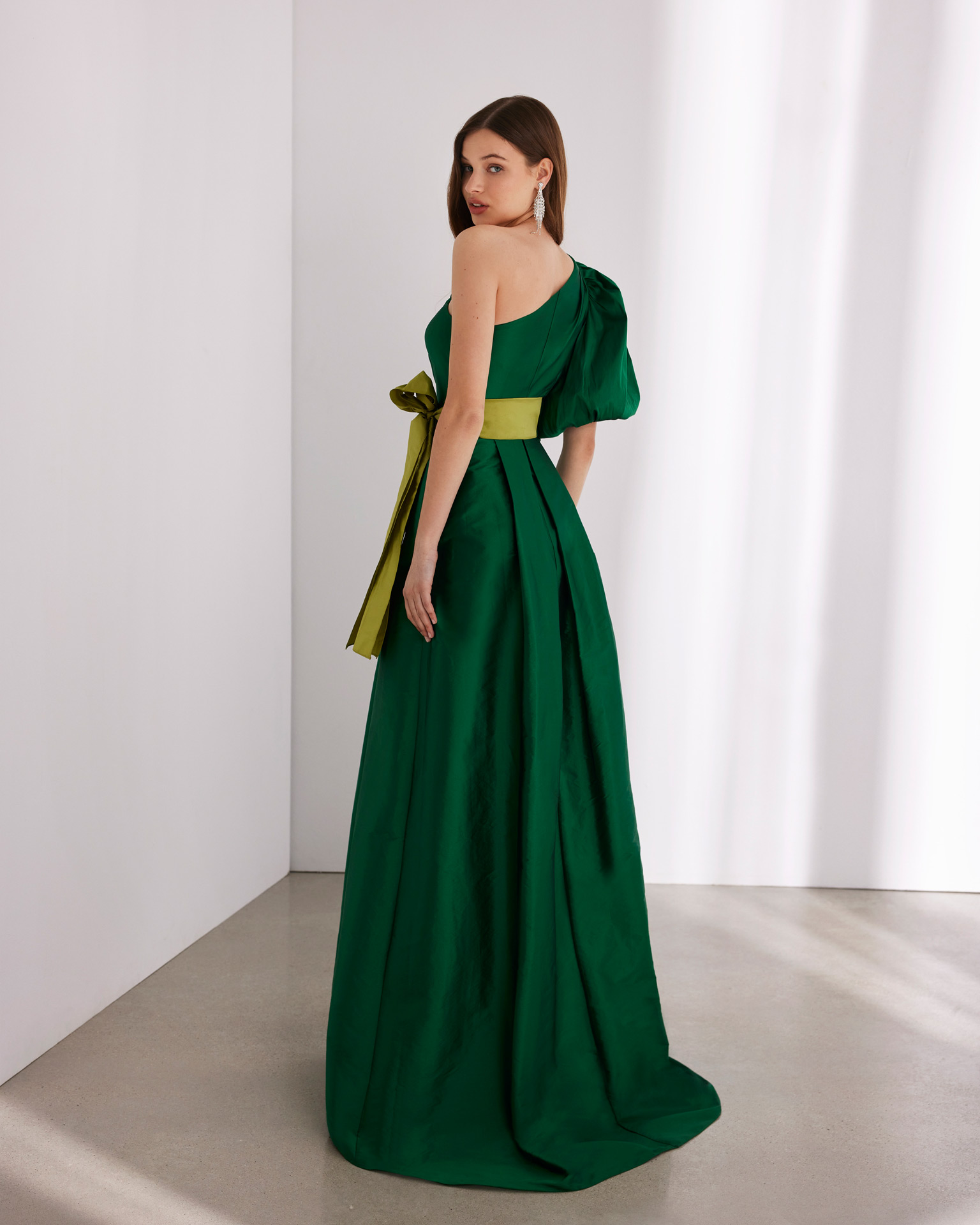Abito da gala lungo in stile elegante. Realizzato in taffetà. Con scollo asimmetrico, manica a sbuffo e cintura.Modello Rosa Clará Cocktail per cerimonie e ricorrenze.