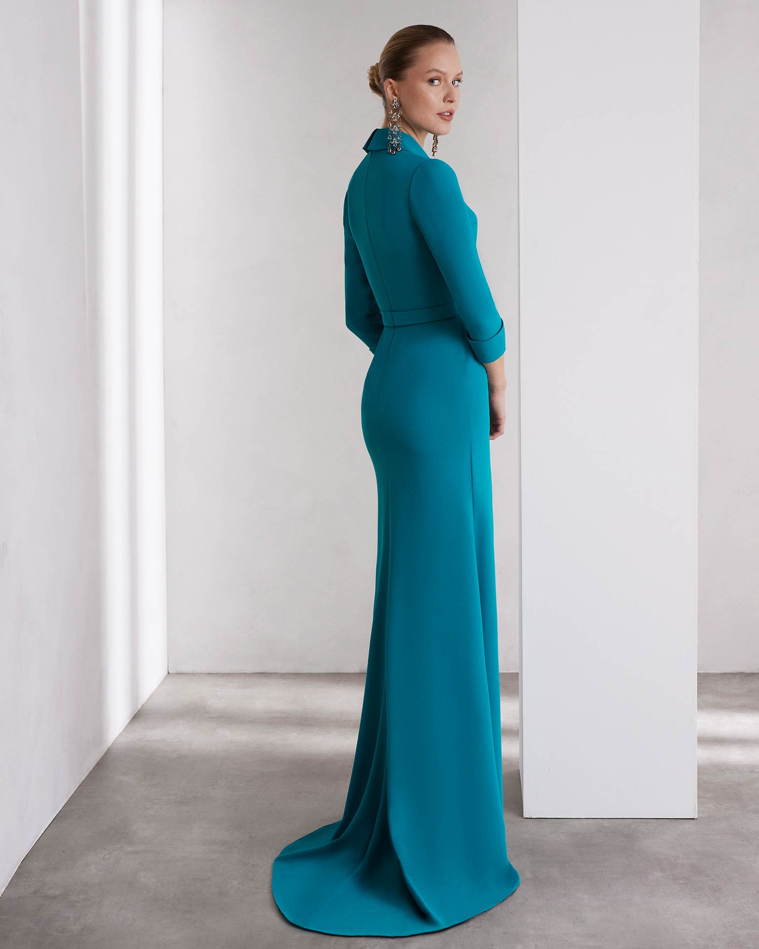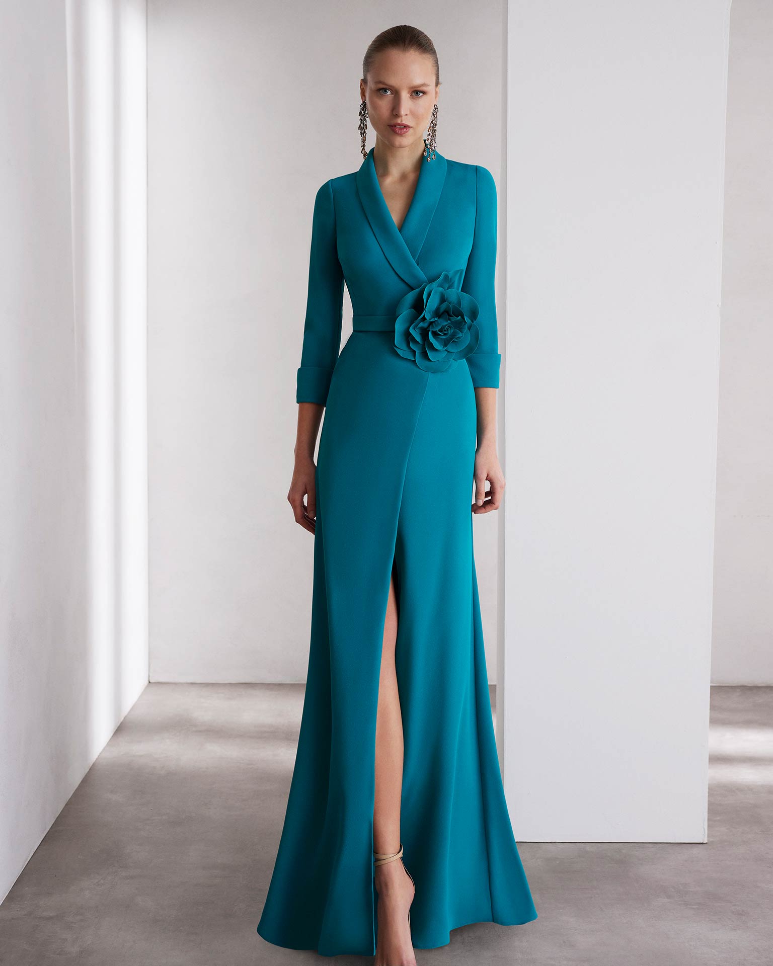 Abito da cerimonia lungo da gala confezionato in crêpe. Completano il modello lo scollo a V, la schiena chiusa, le maniche francesi e il fiore sul corpetto. Un look Rosa Clará Cocktail.